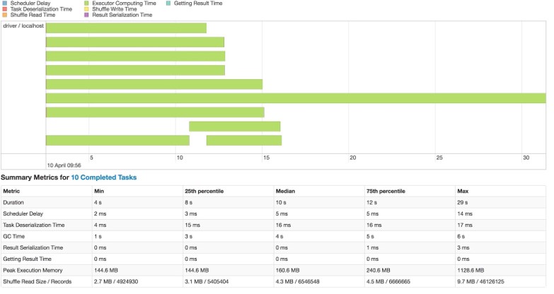 One thing to be careful of with Spark is when using a join to filter your tables you are often using a smaller dataframe for filtering. A broadcast join can be appropriate in this situation, but there is another consideration to make. The overlap in the join keys (i.e. city values) between the small dataframe which was broadcasted and the large dataframe only occurs on a few executors in the distributed dataframe table. This leads to many executors having 0 or very few resulting rows following the join. This scenario can lead to data skew in the resulting dataframe. This reveals itself in downstream operations on the dataframe where many executors complete their work quickly and a few take an extremely long time. This situation can be diagnosed in the Spark UI as shown below,